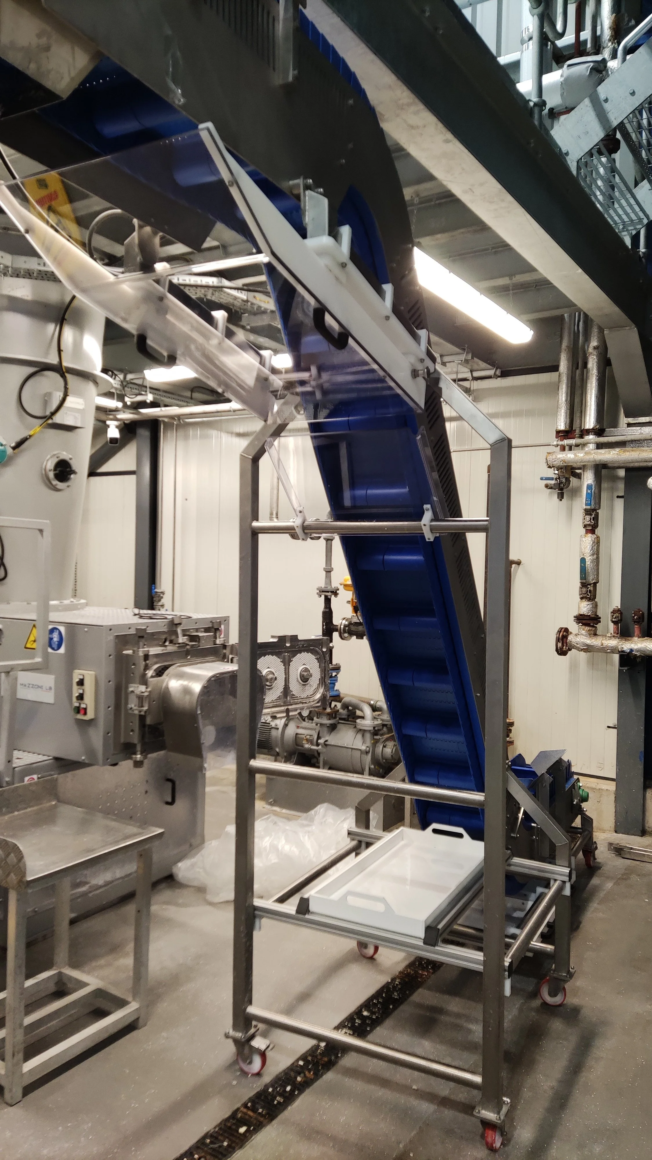 Due to the nature of the material (soap pellets), when the conveyor looped around overhead it dropped quite a lot of the material on the floor. This had made the process very time consuming in additional hours cleaning the wasted soap up. In addition to this, the material is an expensive specialist soap, and once this hits the floor it cannot be reused again adding to the cost and affecting profitability.